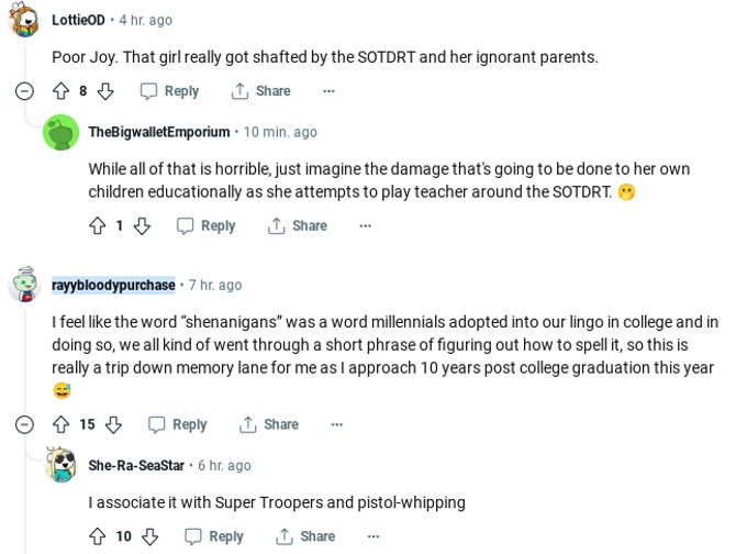 One critic wrote, “Poor Joy. That girl really got shafted by the SOTDRT and her ignorant parents.”