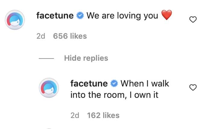 Facetune wrote in the comments section, “We are loving you,” and a red heart emoji.
